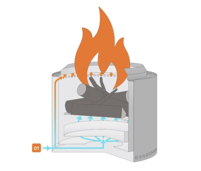 아래에서 데워진 공기가 대류현상으로 2중벽을 타고 위쪽으로 올라가면서 장작을 빠르게 연소시키는 원리다.